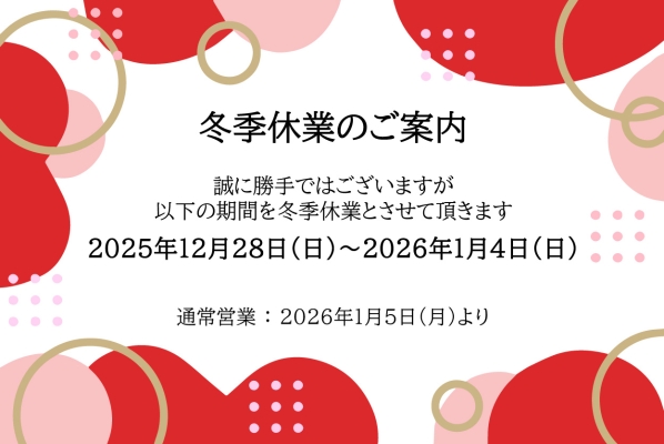拝啓貴社ますますご盛栄のこととお喜び申し上げます。平素は格別のご高配を賜り、厚くお礼申し上げます。さて、誠に勝手ではございますが、以下の期間を冬季休業とさせて頂きます。また検査の受付に関しましては下記...